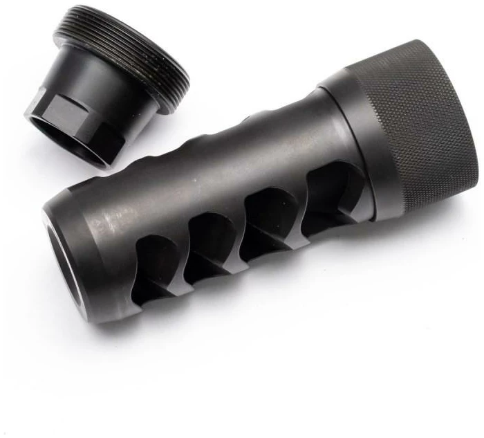 – Proprietary progressive port design. The amount of work done by a muzzle brake as you move away from the muzzle decreases with distance. Knowing this we decided to increase the size of the first port and decrease slightly with every port further out. This keeps the overall length down without sacrificing efficiency.