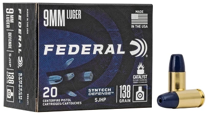 Federal’s all-new Syntech Defense provides dynamic terminal performance with a hollow-point bullet that separates into three segments and a deep-penetrating core on impact. The core penetrates 12 to 18 inches through bare ballistics gel -a critical benchmark in self-defense situations and the best terminal performance of any round in its class. The petals create three secondary channels, each more than 6 inches deep, adding to the terminal effect. Like all Syntech loads, Federal’s advanced polymer jacket eliminates lead and copper fouling and drastically reduces damaging heat and friction in the barrel. Its Federal’s exclusive Catalyst primer provides hot, extremely reliable ignition without the use of lead.