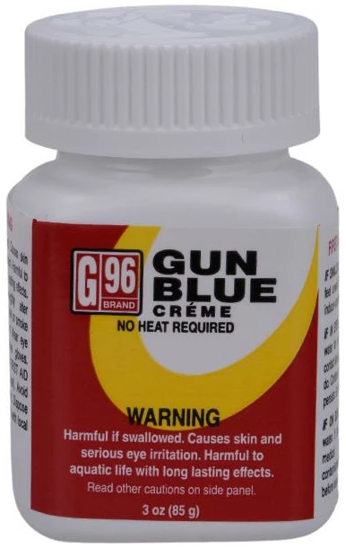 DIRECTIONS: Remove all oil grease or dirt from surface to be blued by cleaning with G96 Gun Degreaser. Pitted or rusted surfaces should be sanded lightly with emery cloth or steel wool. Apply a small amount of G96 Gun Blue crème with a clean patch. After bluing is achieved (after turning greyish usually within 15-30 seconds) neutralize area with water. Wipe dry and apply a protective coating of G96 Gun Treatment or G96 Gun oil or G96 Synthetic CLP Gun Oil for a long lasting lustrous finish. Better penetration is achieved if metal is slightly warm. Wash hands after use.