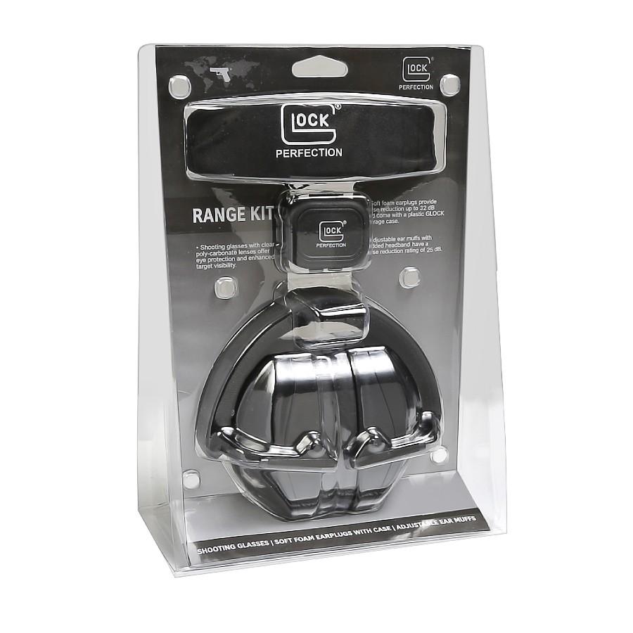 The GLOCK Range Kit is the perfect addition for any range day. The GLOCK Range Kit includes GLOCK Hearing Protection Ear Muffs Hearing Protection Ear Muff holder with integrated belt clip Foam Ear Plugs with connection tether GLOCK Ear Plug case Shooter/Safety Glasses and GLOCK Cloth Pouch.