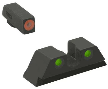 Mepro Hyper-Bright fixed pistol sight features an extremely bright contrasting colored ring front sight. Shooters can select from one of three colors? Green Yellow or Orange?for the front sight. The tritium is illuminated green to provide low-light and nighttime aiming capabilities. The contrast in colors of the two components helps the shooter focus on the front sight quicker which is critical in defensive and competitive shooting