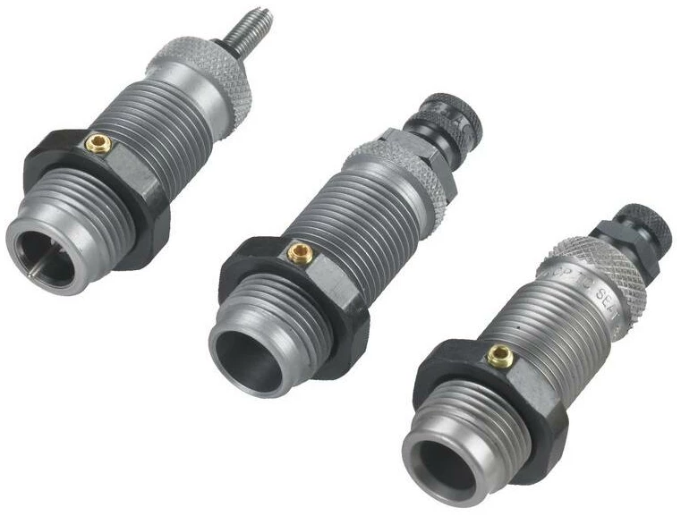 RCBS pioneered and developed 3-Die Sets for straight-wall rifle and pistol cases. The Carbide Sizer Die sizes the case and de-primes (the carbide sizer ring eliminates the need to lubricate). The Expander Die expands the case to the proper diameter to accept the bullet and it imparts case mouth flare/bell for bullet feeding. The Seater Die seats the bullet and roll crimps.